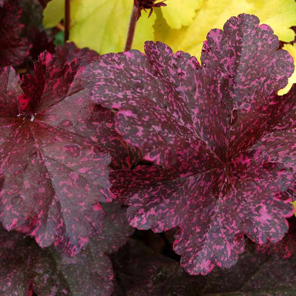 What fabulous colour! Heuchera 'Midnight Rose' is one of the most interesting looking Heucheras to come along in a while. Commonly known as Coral Bells, this cultivar is a clump-forming perennial which can spread up to 17 in - 43 cm wide. It produces tiny flowers in early summer on slender, wiry stems that rise above the foliage mound. Heuchera are an ideal ground cover for rock gardens, borders or in open woodland areas. It can also be very effective as an edger along paths or walkways.