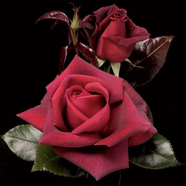 Big showy blooms of blended dusky red and dark pink glimmer against foliage so gloriously glossy it almost looks artificial. This hybrid tea boasts a powerful perfume that will have you instantly fall in love.